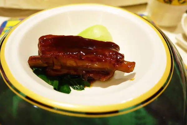 「老滿祕制大排」是火工菜的代表作,用精選豬肋排加入獨家祕製醬汁熬煮至油亮入味,簡單用川燙後的青江菜舖底,形成一道簡單又美味的料理。