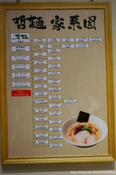 牆上掛著哲麵的家系圖,西門誠品116店是台灣初代直系的繼承店,林森店是橫系發展的加盟店,