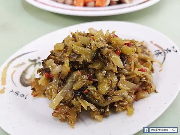 吃牛肉麵必加的酸菜採自取的方式,我拿了一大盤;酸菜鹹香頗有味,辣度是蠻明顯的。