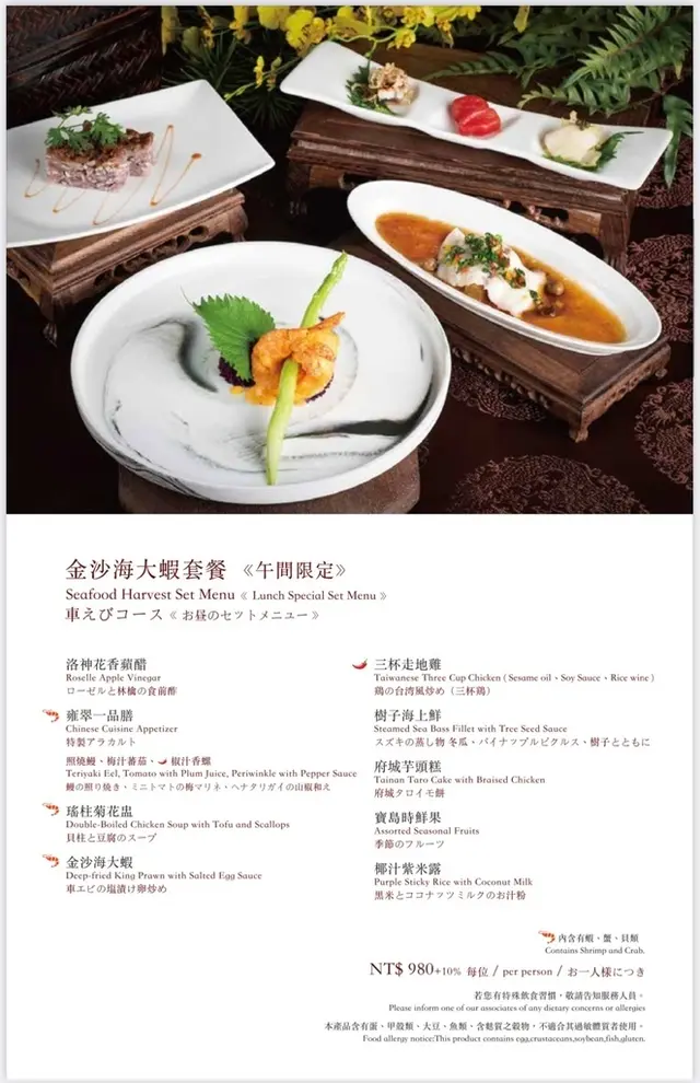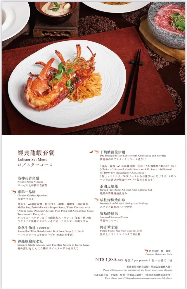 $980海大蝦套餐 (午間限定) $1080蔬食套餐 $1380鮑魚套餐 $1880龍蝦套餐 $2580海陸套餐 熱門推薦:紅槽走地雞、紅燒牛肉麵。