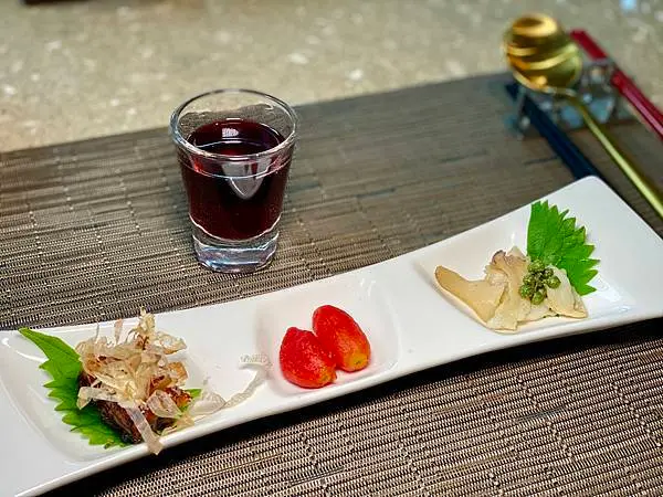 烏魚子 山藥麵 照燒鰻 炙燒干貝(台灣金華火腿) 醉雞 椒汁香螺