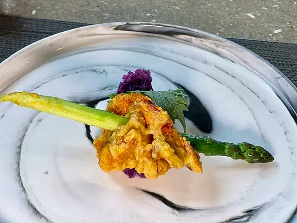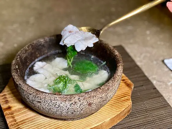 鱸魚肉片在熱石碗中擺成花朵狀,