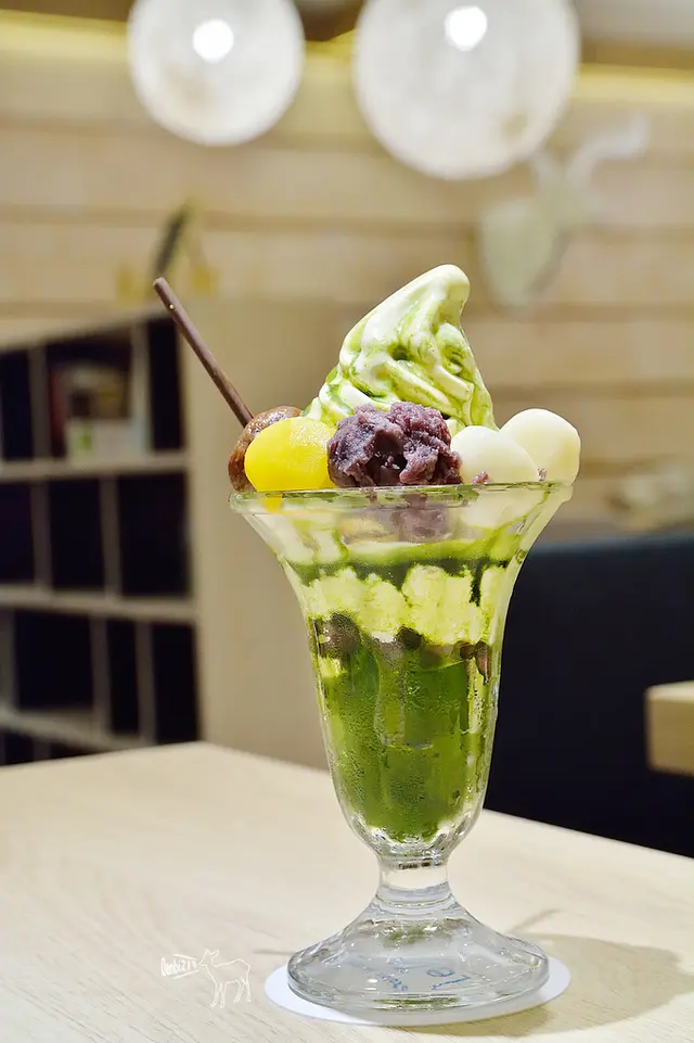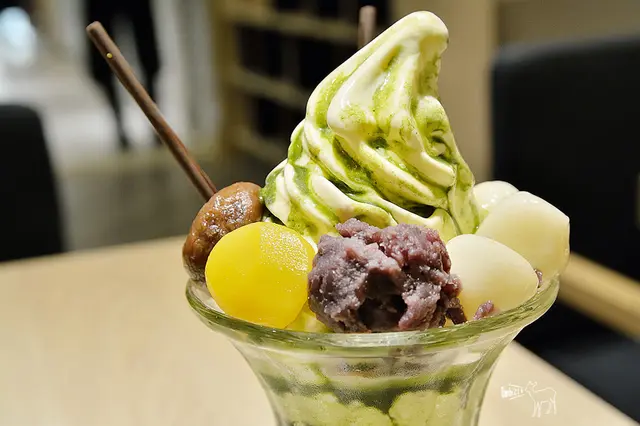 因為低消的關係,所以我另點了一份聖代,牛奶霜淇淋的口感綿密、奶味濃郁、略帶鹹度,一旁有以兩支巧克力、三顆白玉、一小球紅豆泥、兩顆栗子、玉米片裝飾,底部有抹茶茶凍,茶凍的抹茶味有出來。