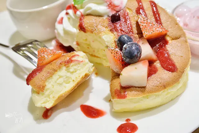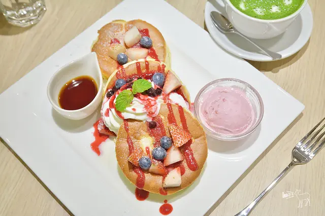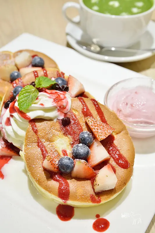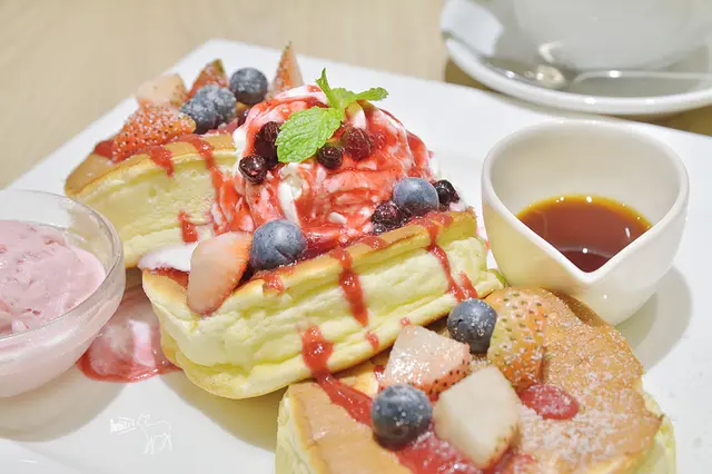 內容物為三片厚燒鬆餅+草莓冰淇淋+楓糖漿+莓果醬、鮮奶油、藍莓與草莓。