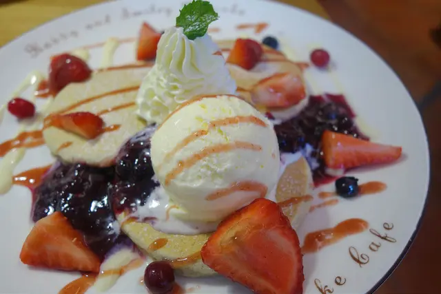 鬆餅是七穀原味鬆餅,三片的份量,一大球香草冰淇淋,爽口的鮮奶油,草莓丁與梅果醬