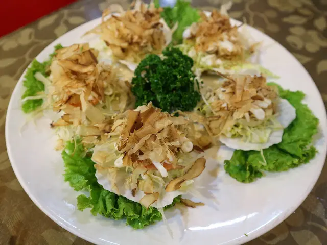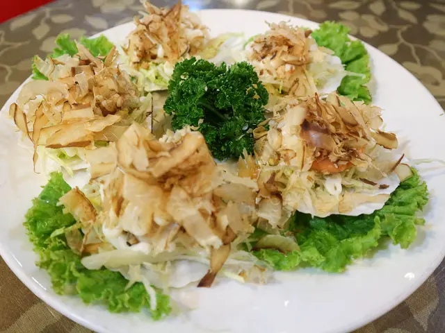 扇貝上放上高麗菜絲與美奶滋還有大量柴魚片