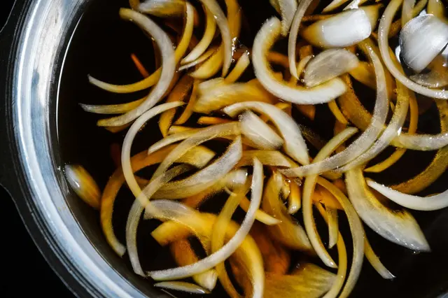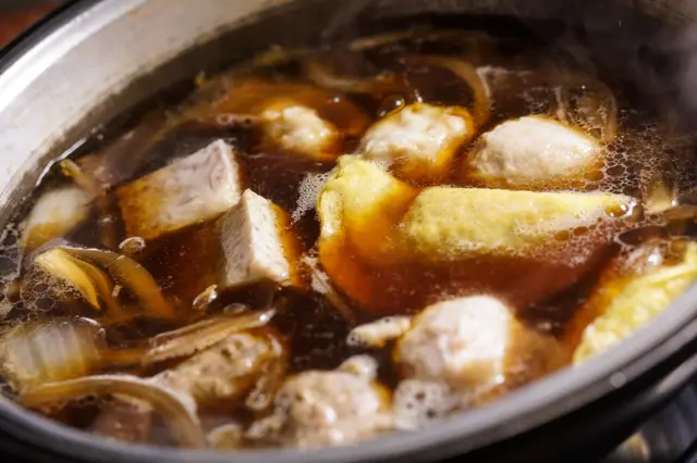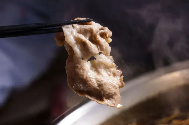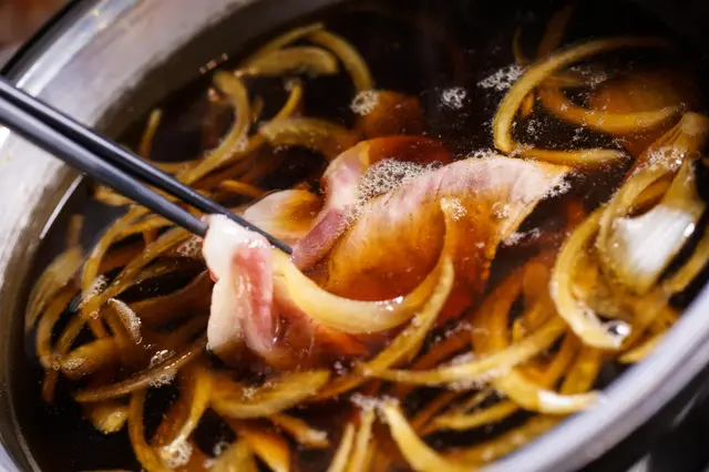 使用日本進口壽喜燒醬汁,再加入洋蔥增甜味,嚐起來口味偏甜,拿來涮豬肉剛好。