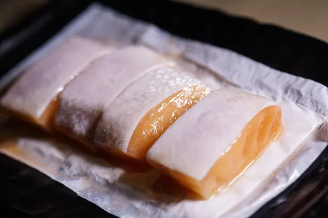 鮭魚肚油脂豐富,魚肉薄薄一層上下都被油花給包覆。涮煮後,口感入口即化且鮭魚香氣濃郁,但味蕾上還是較油,歐奇吃不太習慣。