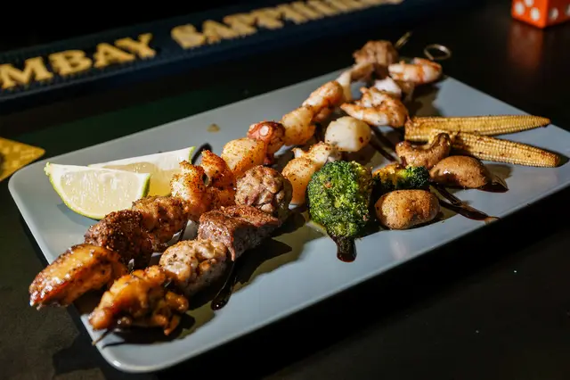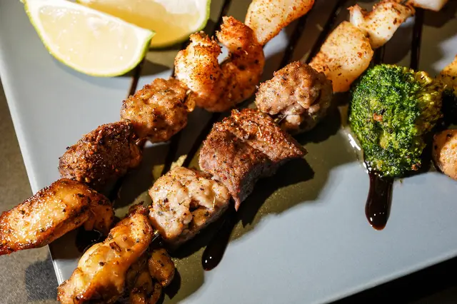 烤肉串食材豐富,有牛排、雞肉、特製肉丸、干貝、鮮蝦、章魚等食材
