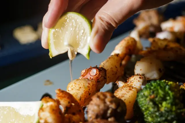 海鮮部分,可以擠上點檸檬搭配,章魚火烤的程度剛剛好,兼具表層的嚼勁及內裡的嫩口