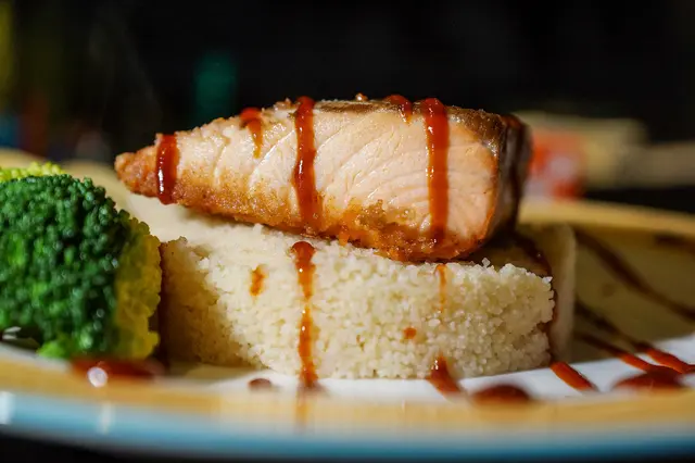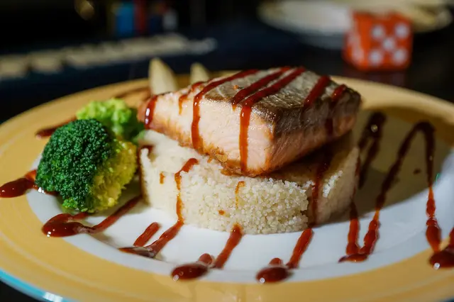香煎鮭魚排搭配上北非小米,上方淋的海鮮醬汁酸酸甜甜的是精華