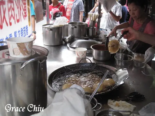 打從開始排隊起看老闆的手幾乎沒停過的一直從油鍋裡撈肉圓.放肉圓,把肉圓撈起來放進袋子前還會細心的瀝油,老闆娘就負責不停的舀醬.打包.舀醬.打包,非常忙碌.