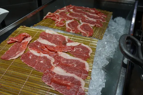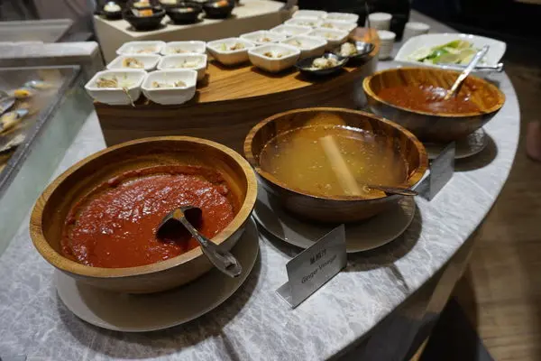 還有台北Buffet少見的現沖牛肉湯,食用方式是先將生牛肉夾入湯碗中,