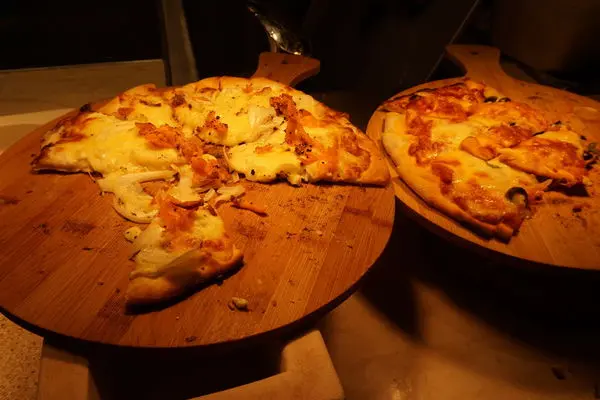 現烤Pizza口味有3-4種,有奶油鮭魚、義式肉醬和青醬海鮮等等,