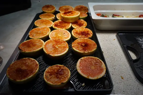 將砂糖和白蘭地放在切對半的葡萄柚上,經過火槍烘烤後外型好美麗~