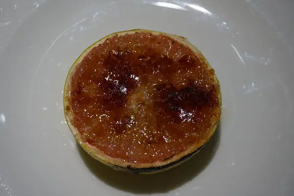 白蘭地遇熱揮發很快,表層的焦脆糖片中和了葡萄柚原本的苦酸味,