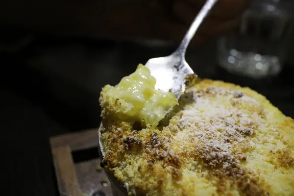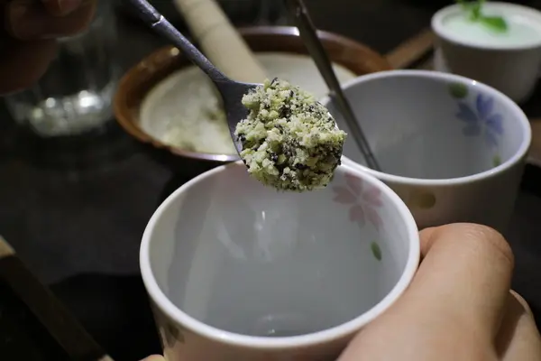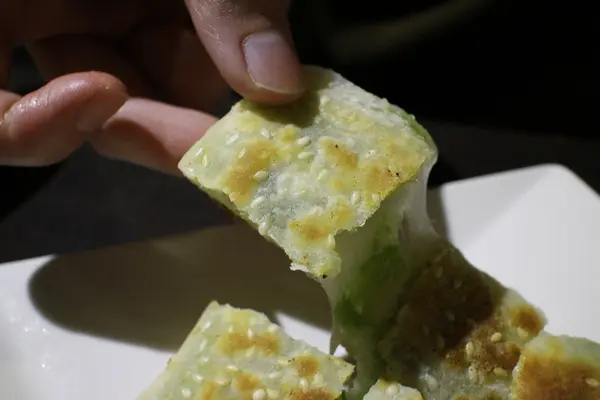 擂茶粉包裹於麻糬中,再包上一層餅,以鍋煎製成金黃的外衣。