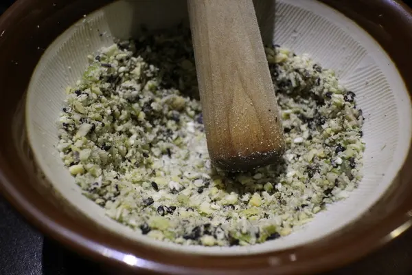 上擂茶之前附上一碗堅果,黑白芝麻、花生、葵瓜子、南瓜子,喝擂茶時可加上堅果粉,讓味道更香濃。