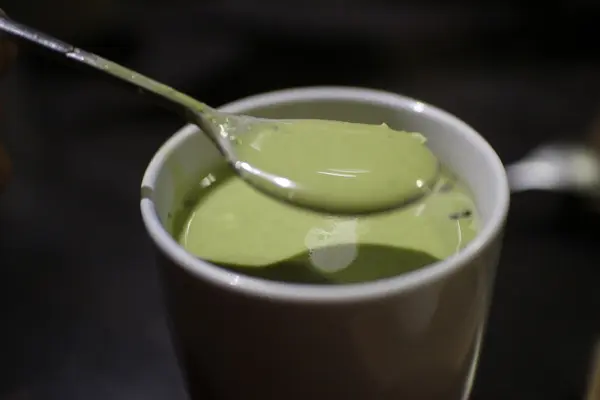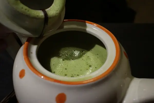輕輕拉開的麻糬鍋餅,軟軟的麻糬滋味配上擂茶,很新穎的吃法。