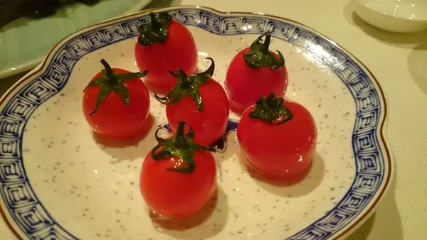 這道菜挺有趣,小番茄外表裹著一層玻璃糖衣,裡面則是鑲著以美乃滋調味的酥炸油條。