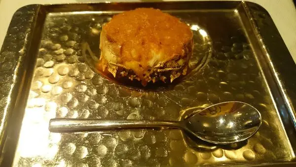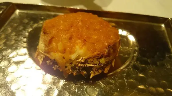 這是個費事的功夫菜。把蟹肉生拆下來之後,與蛋白、筍丁一起填進蟹蓋裡烤。