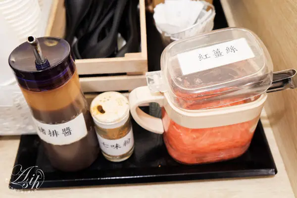 還有紅薑絲跟豬排醬、七味粉可以用喔