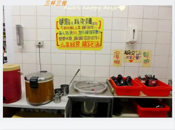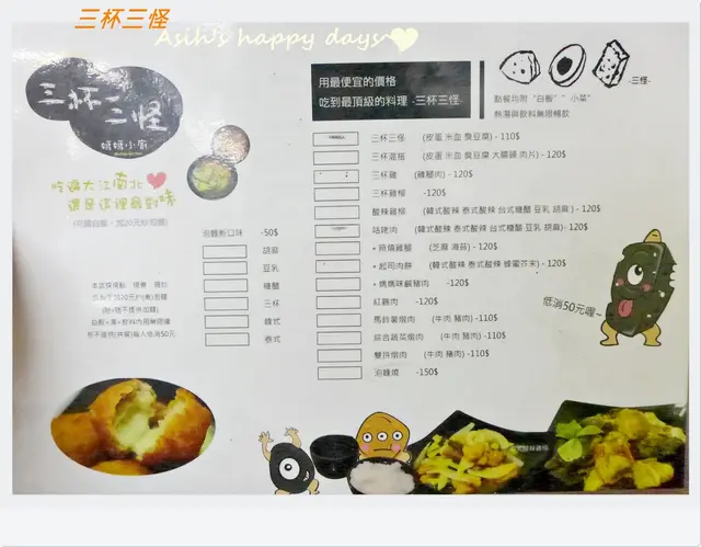 斗大黑白配色招牌寫著:三杯三怪/媽媽小廚(旁邊還有可愛的插畫三怪們)