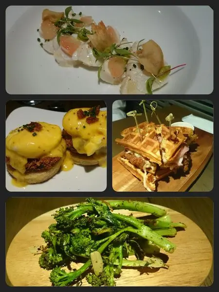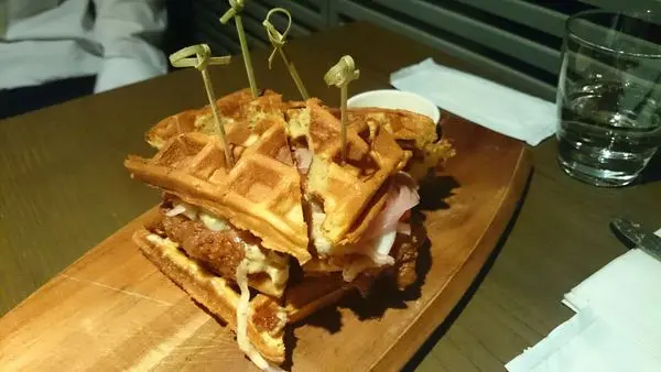 格子鬆餅夾著酥炸雞胸肉、醃製洋蔥和格瑞爾起司,好好味。要不是有新朋友在場,而且肚子已經撐到幾乎要彈扣,我實在很想多吃1/4。