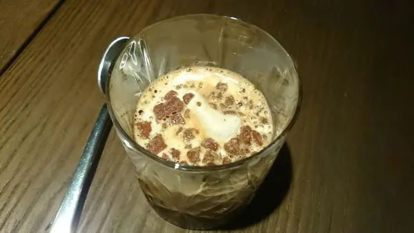 上桌時杯子裡裝著香草冰淇淋、杏仁巧克力餅碎片、威士忌焦糖漿,服務生會現場幫忙把濃縮咖啡倒進杯子,成品就是上面照片的樣子。