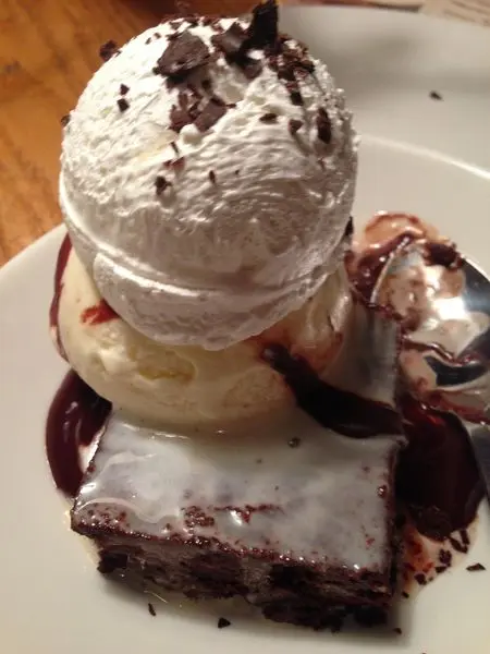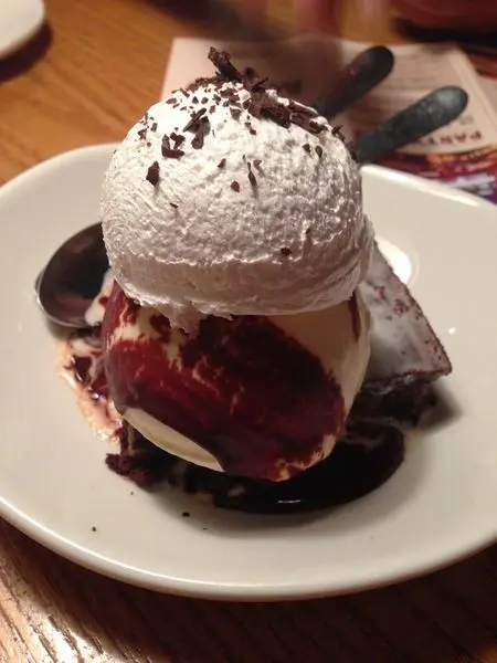 他的最上一球是奶油!中間那一球式香草冰淇淋~最下層是一塊布朗尼巧克力!