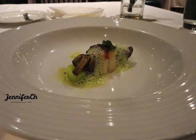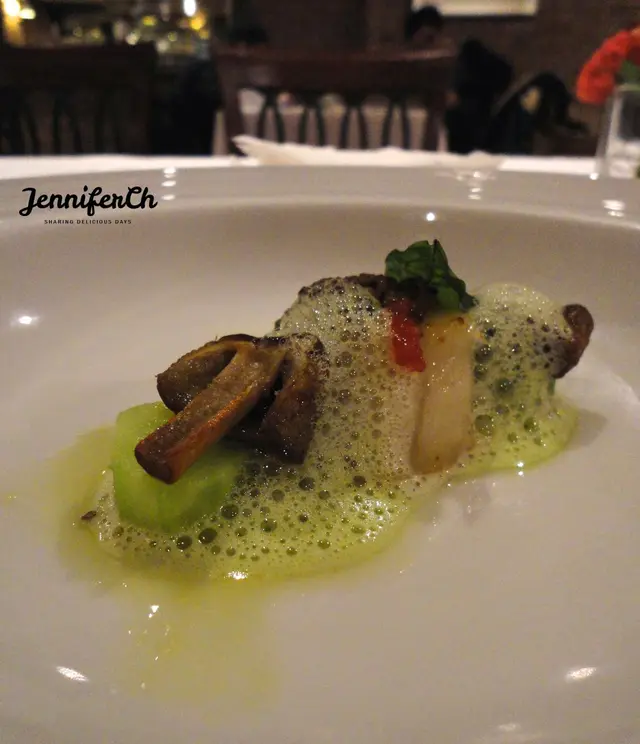 這是開胃菜,用分子料理的手法製作,旁邊的香檳茸調味比較鹹一些,正好跟底下的蔬菜搭配,很對味。