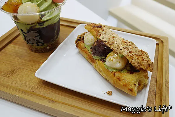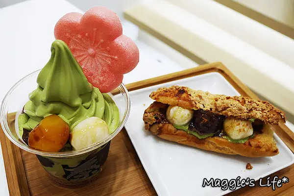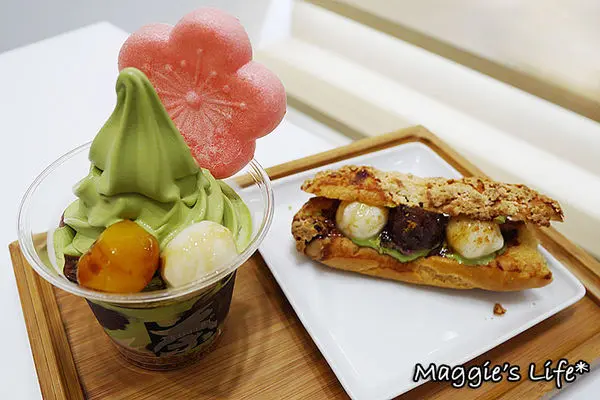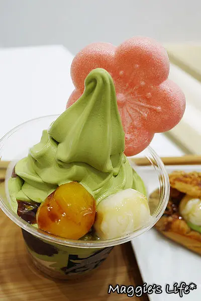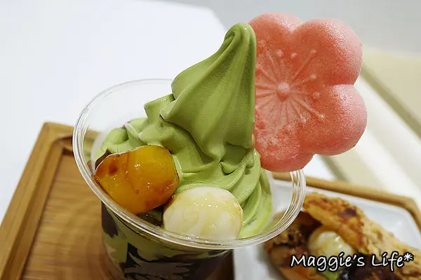 這款抹茶聖代有濃濃的日本和風味,用白玉湯圓、粟子和一片櫻花紅莓最中餅裝飾,看了就覺得好好吃。