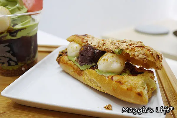 而抹茶霜淇淋下面有一層紅豆泥和玄米,最底下的玄米是採用日本進口用大火烘焙,口感吃起來香香脆脆的,即便是和著霜淇淋吃口感依然不變,更增添多層次風味。