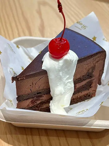 甜中帶點微微苦的厚黑巧克力蛋糕,裏頭使用酒釀的黑櫻桃點綴,酸甜風味更能襯托巧克力的濃厚韻味~