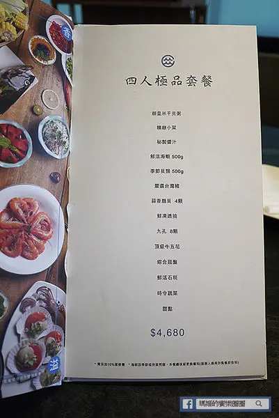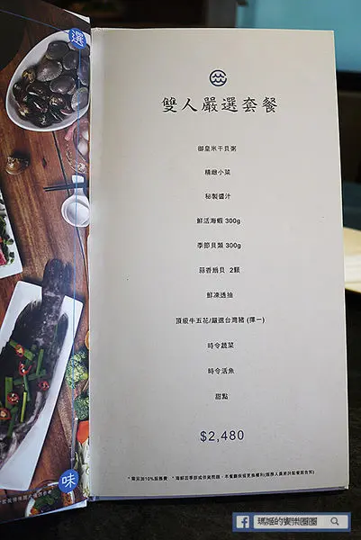 今天品嚐的就是$2,480的雙人嚴選套餐,包含御皇米干貝粥、精緻小菜、秘製醬汁、鮮活海蝦 300g、季節貝類 300g、蒜香扇貝 2顆、鮮凍透抽、頂級牛五花 or 嚴選台灣豬、時令蔬菜、時令活魚、甜點等一道又一道的美食。