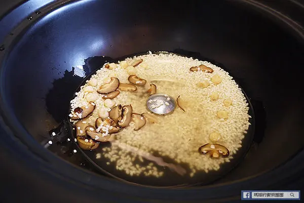 在開鍋時先在最底層放入干貝香菇粥的材料,御皇米則是以生米直接下去煮,過程中不加任何水,僅透過蒸煮過程中海鮮原汁滲入底層,加上嚴選干貝與香菇本身的風味。