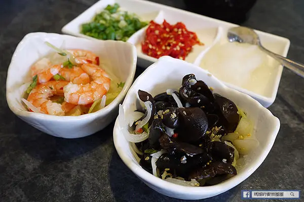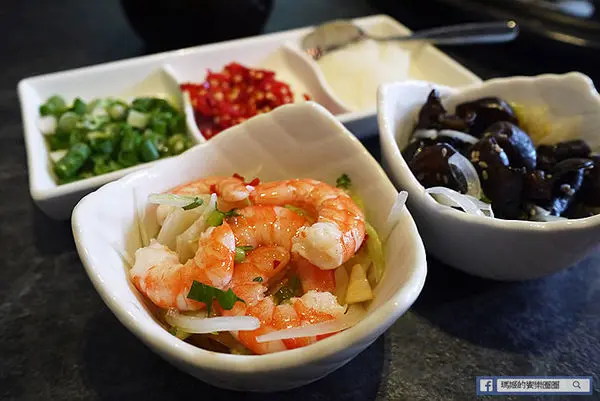 在等待蒸鍋煮熟食物前,先送上二味涼拌小菜,嚐起來酸甜開胃的海帶和鮮蝦,甘甜鮮美,我們都吃光光。