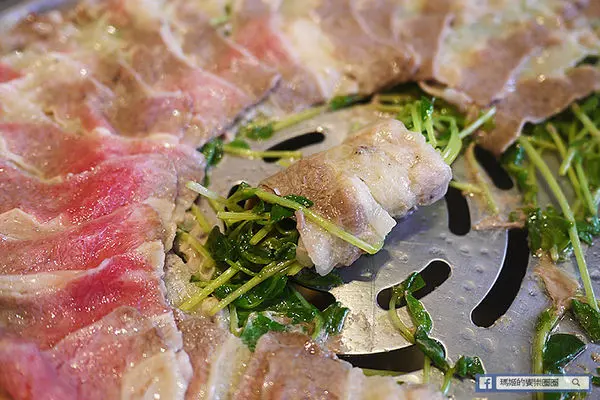 油脂均勻的牛五花蒸約五分熟,吃的時候再把底下的綠色小豆苗捲入肉片中,灑上一些海鹽就能食用。