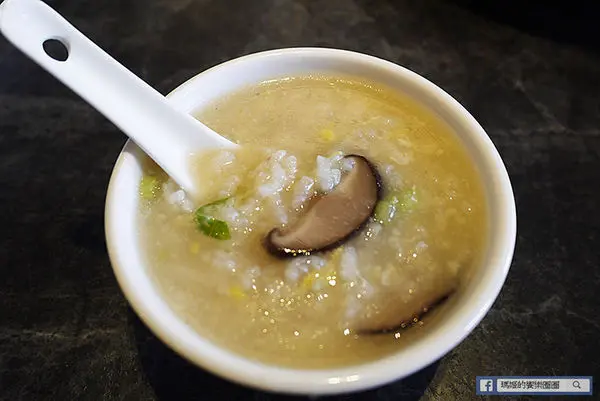 全部食材都蒸熟食畢後,在底下蘊釀很久的干貝香菇粥,再打入蛋液與芹菜點綴成精華海鮮粥,而這樣煮食過程讓粥有海鮮風味卻又不會混雜在一起,並且增加高普林的風險。