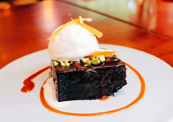 黑巧克力蛋糕淋上苦甜巧克力醬及萊姆酒海鹽焦糖醬,