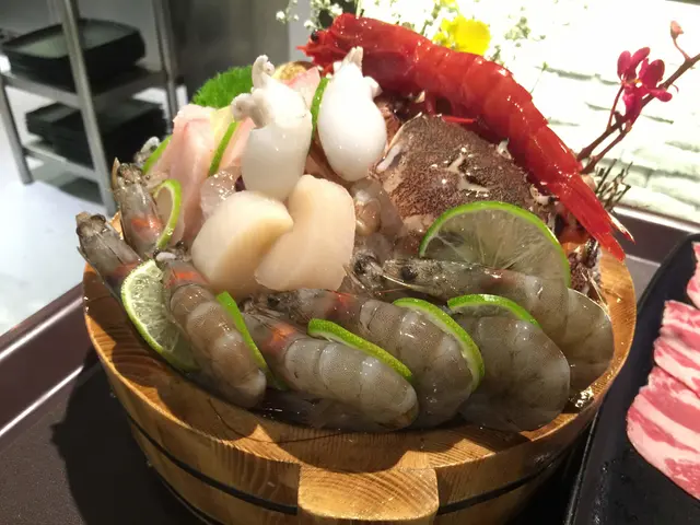 鮮蝦、黃金蟹、干貝、生食等級的姻脂蝦、蛤蜊、一口花枝、多利魚,