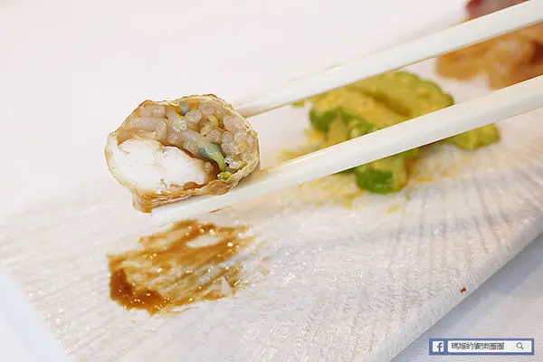 芝麻豆魚,以豆皮捲入新鮮魚肉和豆芽菜,外層以特調醬汁入味,一口嚐可以在豆香、魚香和清脆爽口的豆芽菜中得到一種豐富的口感!