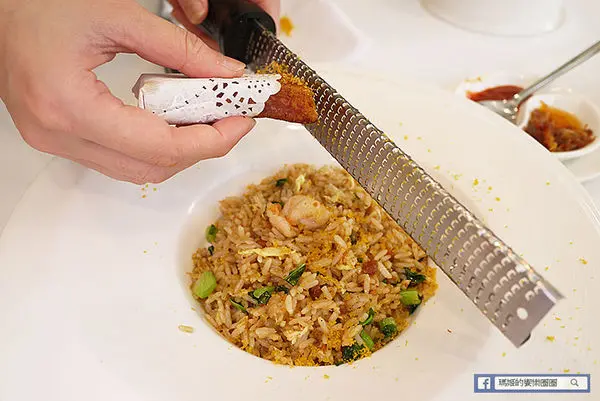 服務人員有節奏的刨著如雪般落下的烏魚子,讓整盤炒飯口口皆有鹹香烏魚子的風味。