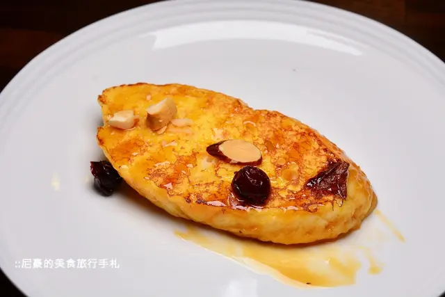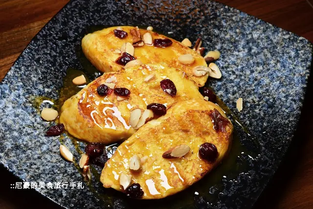 然後再由鐵板煎過後,淋上太妃糖漿以及堅果就完成囉