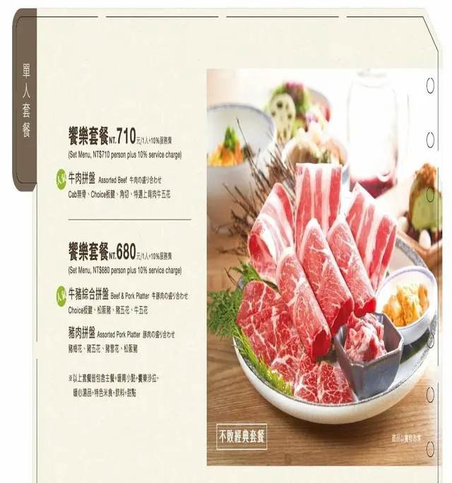 林森北店除了其它店都可以吃到的套餐之外,還有供應饗樂套餐,中午也有推出商業午餐與比較高單價的黑鑽雙響套餐