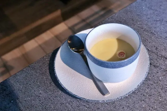 頗有質感的容器裡呈裝一抹鵝黃,再以小巧可愛的魚板點綴,挖一口內裡細緻滑嫩充滿蛋香味。