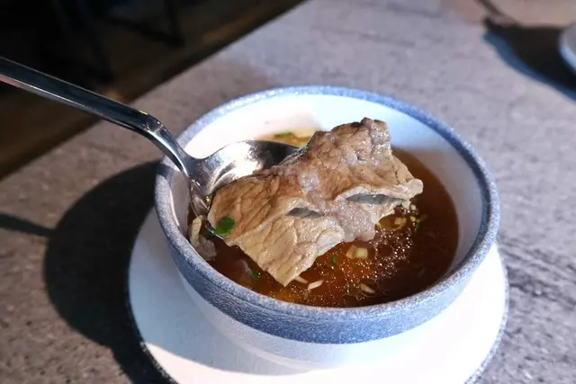 這碗湯也太佛心了不僅有著滿滿食材,還放入嫩口牛肉片,佐以蘿蔔、菇類一起入口,湯頭清爽介於紅燒與清燉中間。