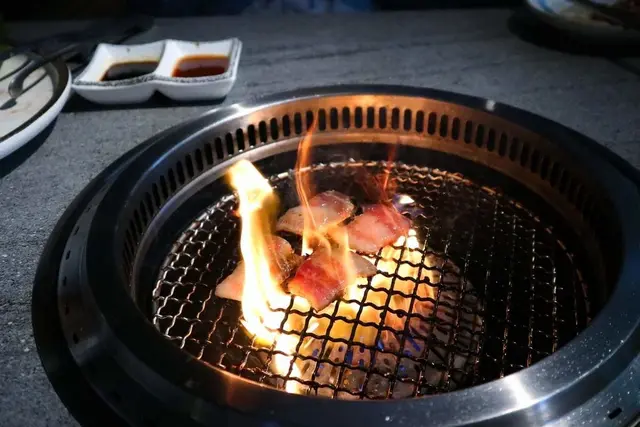 ▲牛五花一放下去沒多久變吱吱作響,翻面時奔放的火之舞瞬間在烤爐內竄起,果然油脂豐沛肥美,