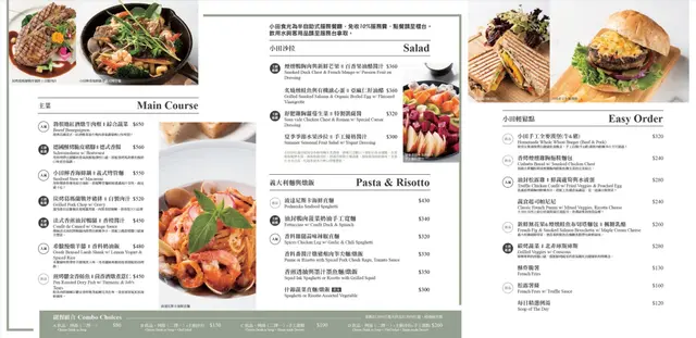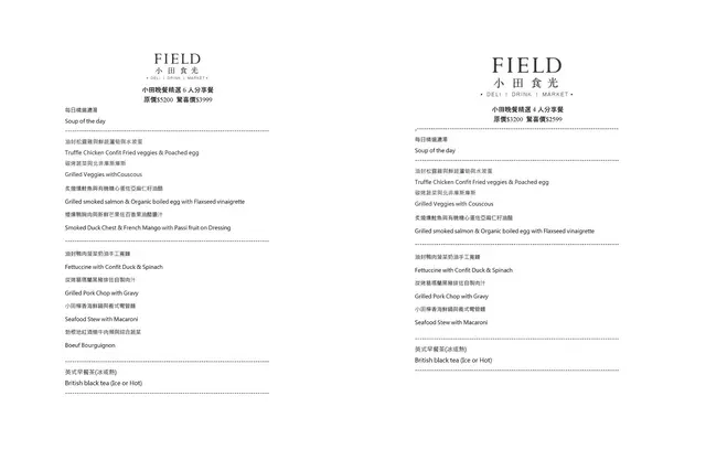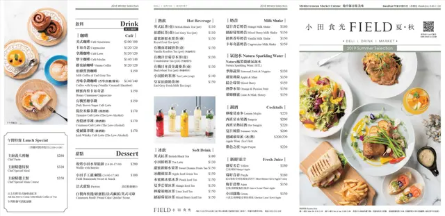 小田食光 FIELD的菜單,小田食光 FIELD會隨著季節不同不定時來更換菜單,小田食光主打主打地中海飲食概念的餐點,藉由多樣的料理烹調手法呈現食材本身的味道,在菜單的設計上也追求營養均衡,餐點都有蔬菜,肉類,五穀雜糧的搭配,除了單點之外,現在也有多人套餐的組合可以選擇唷