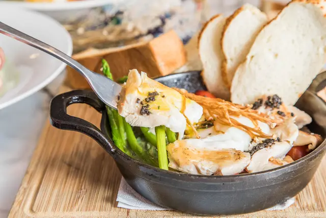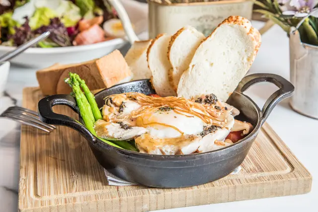 主廚使用的是雞胸肉,以舒肥做法讓雞胸肉吃起來更鮮嫩多汁,加上些許的松露醬提香,在嗅覺味覺上都相當有驚喜感,可以搭配濃郁香醇的水波蛋及鮮脆的蘆筍一起吃,旁邊附的麵包薄片也很加分,沾著醬汁或是搭配雞肉一起吃,層層堆疊的美味!